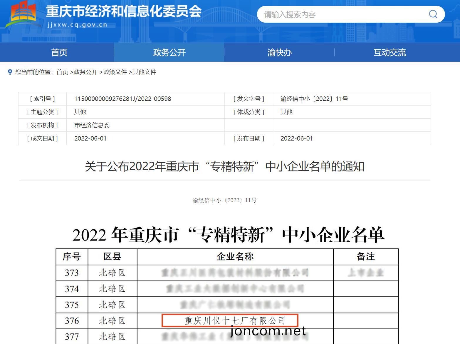 川儀十七(qi)廠(chang)公司(si)入選(xuan)2022年(nian)重慶(qing)市“專(zhuan)精(jing)特(te)新(xin)”中(zhong)小(xiao)企(qi)業名單