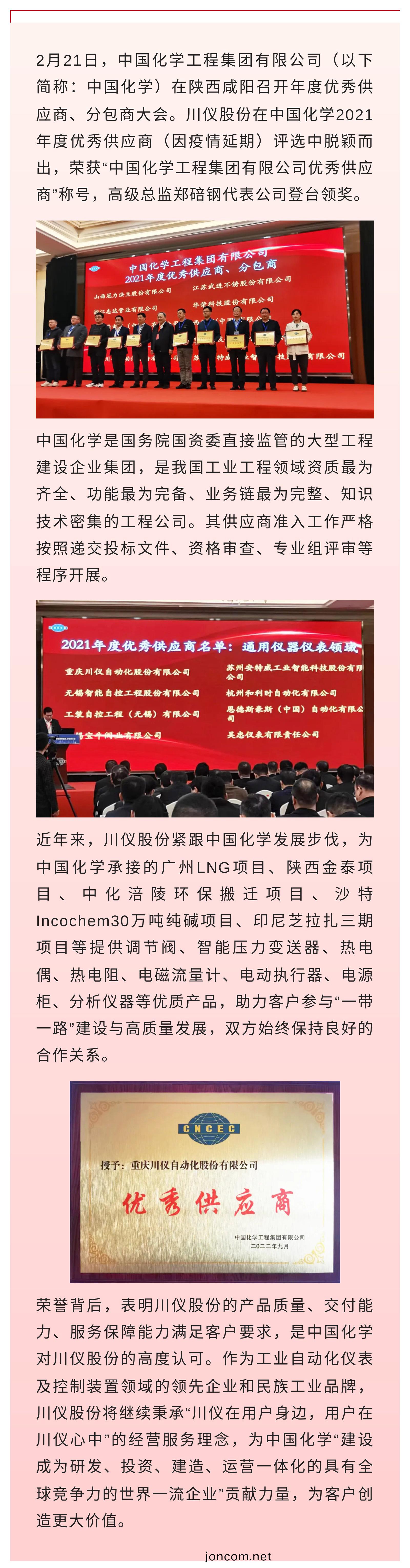 川儀(yi)股份榮(rong)穫“中國(guo)化(hua)學(xue)工(gong)程集糰(tuan)有(you)限公司(si)優(you)秀供應(ying)商”稱(cheng)號(hao)